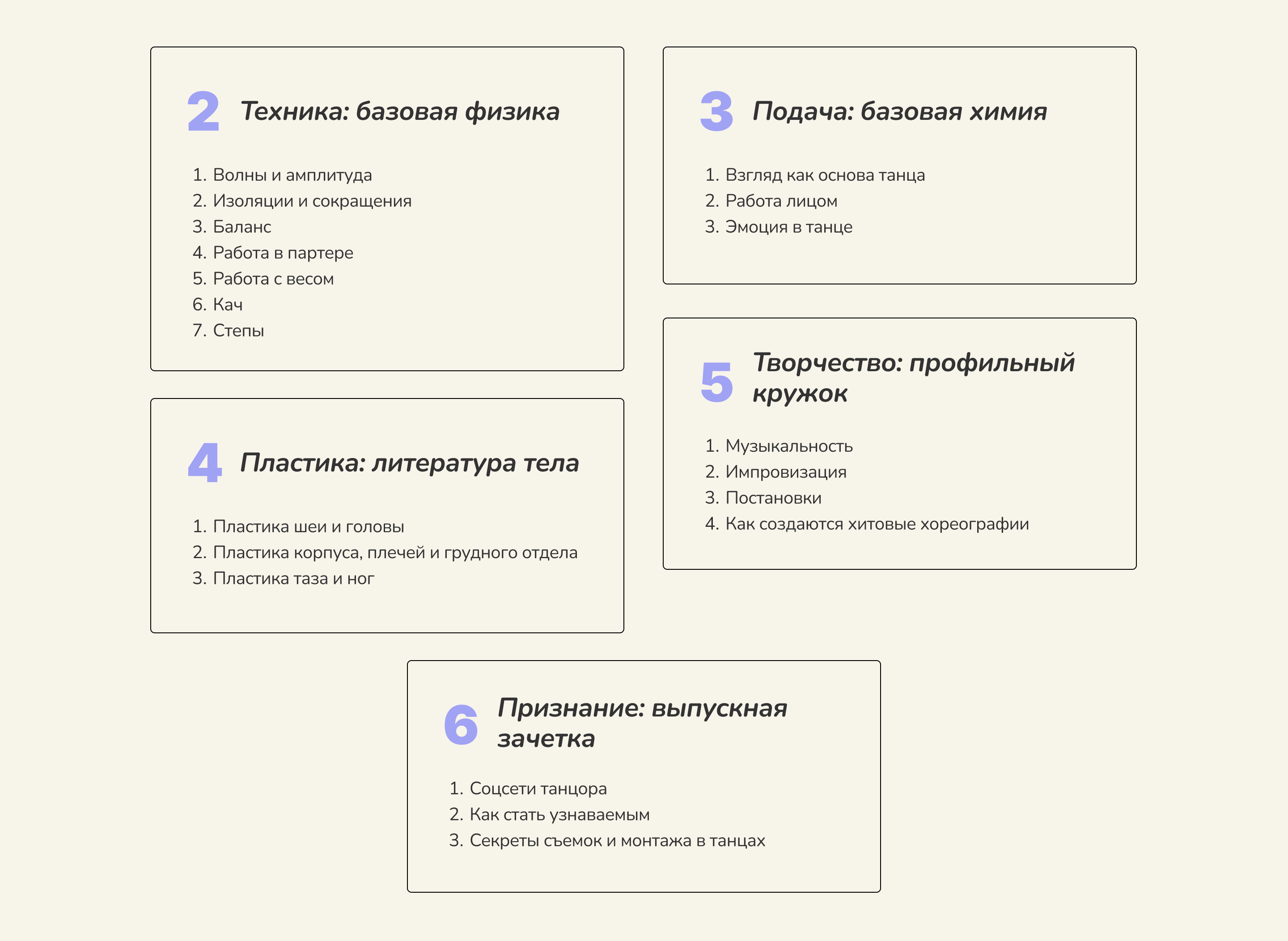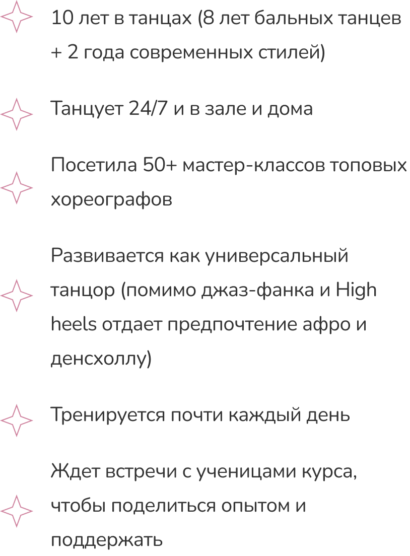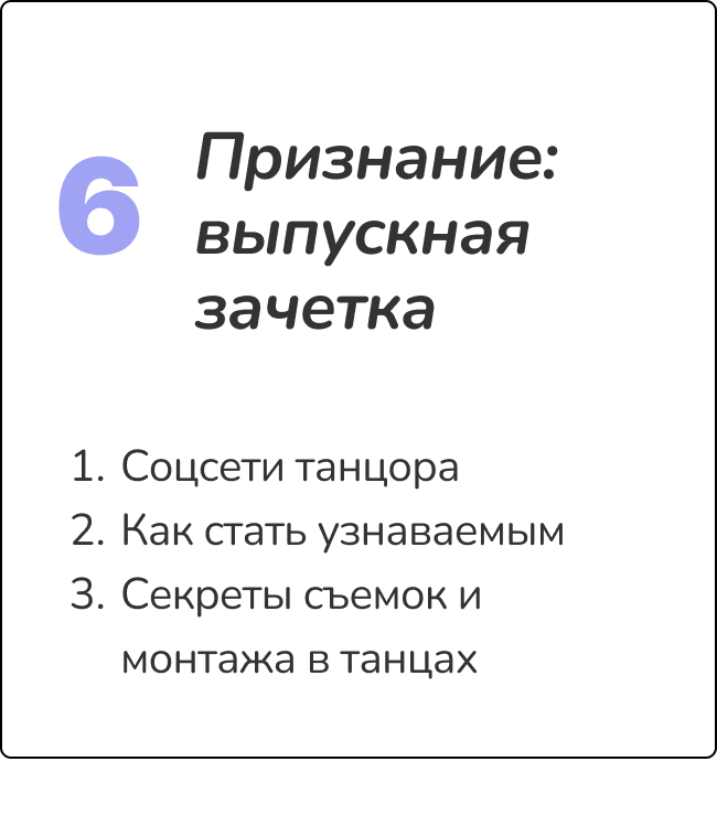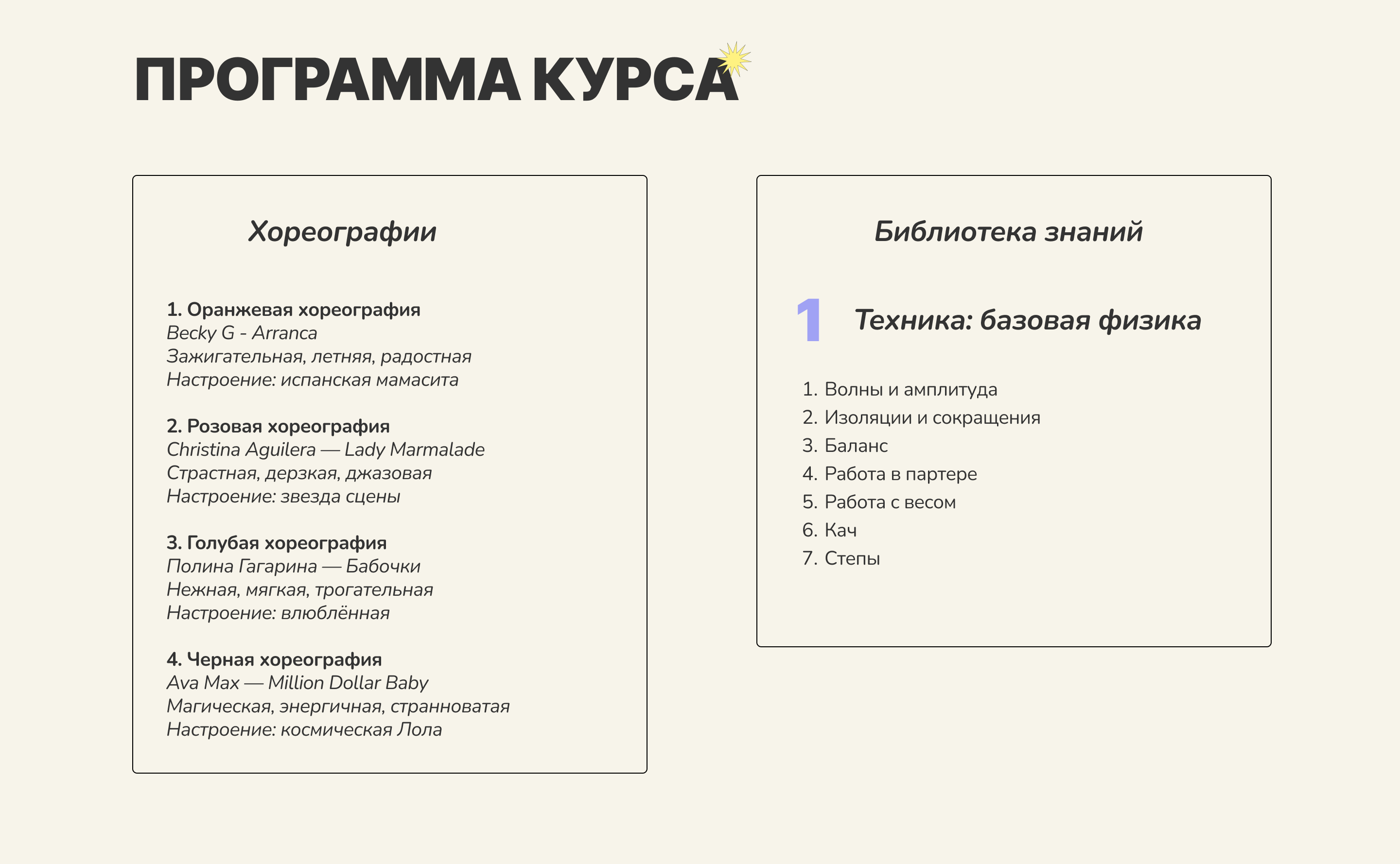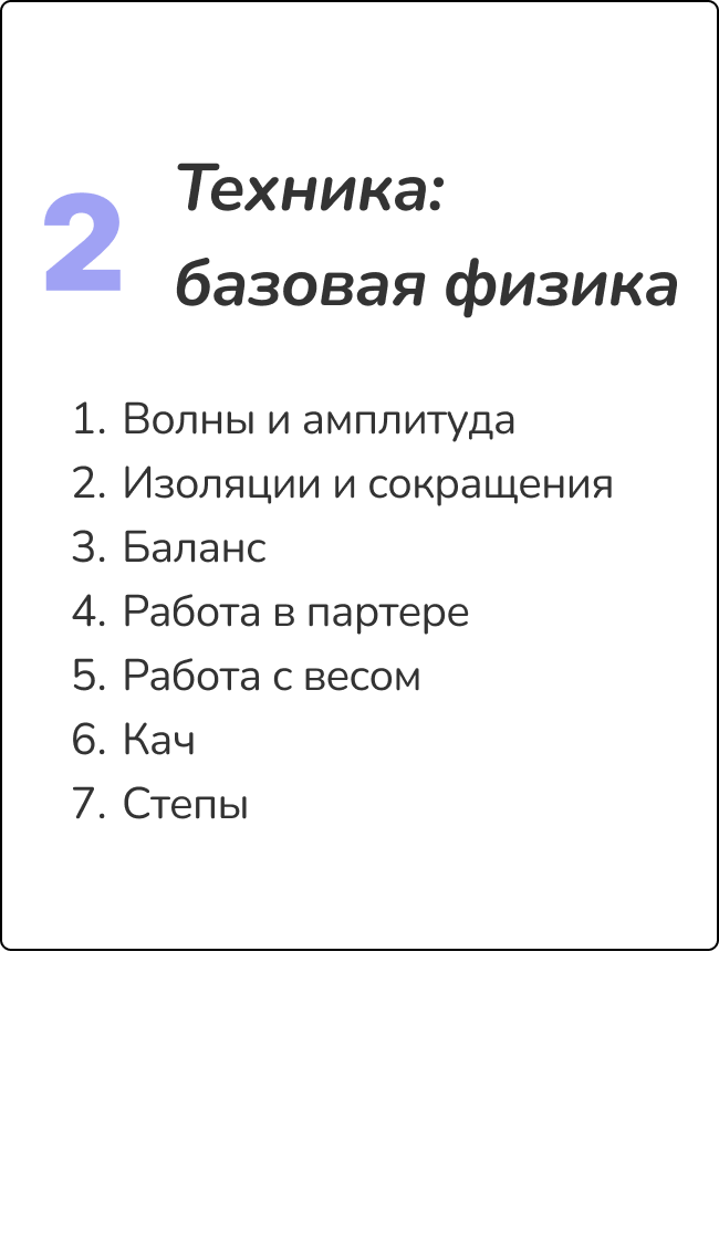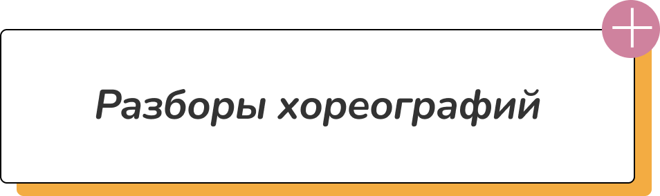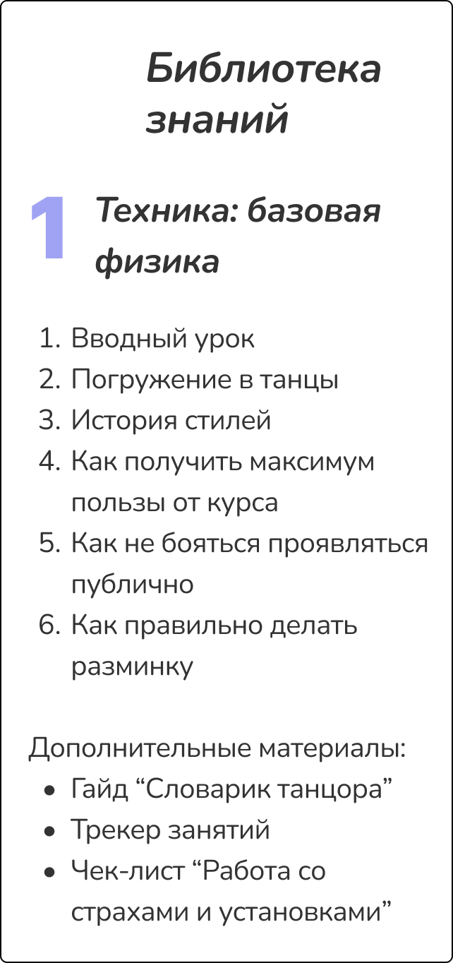 На курсе мы посвящаем время не только разучиванию конкретных связок, но и развитию твоей базы. Тебе будет доступна библиотека знаний, где ты сможешь освоить разные техники, отработать их во время курса + узнать полезные лайфхаки о съемке, постановках и т.д.