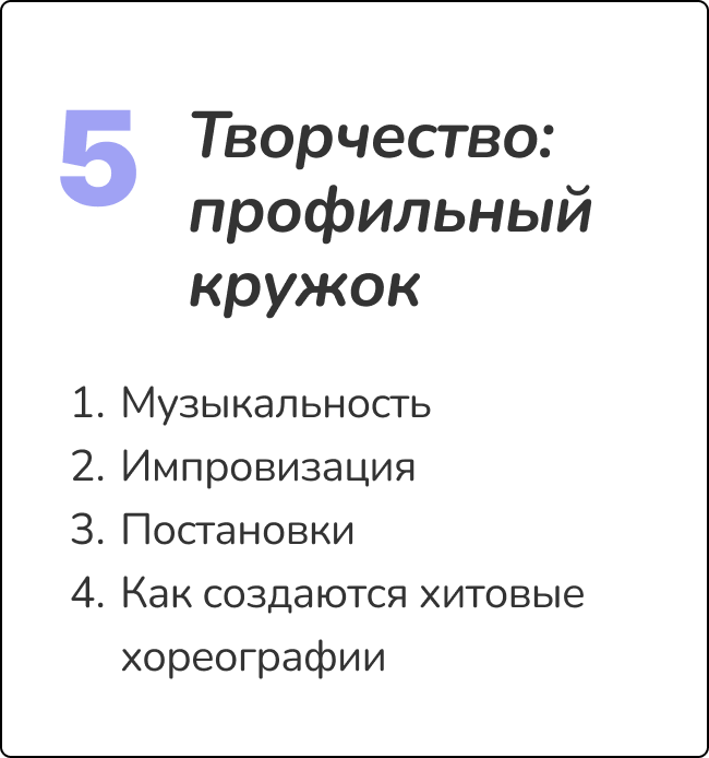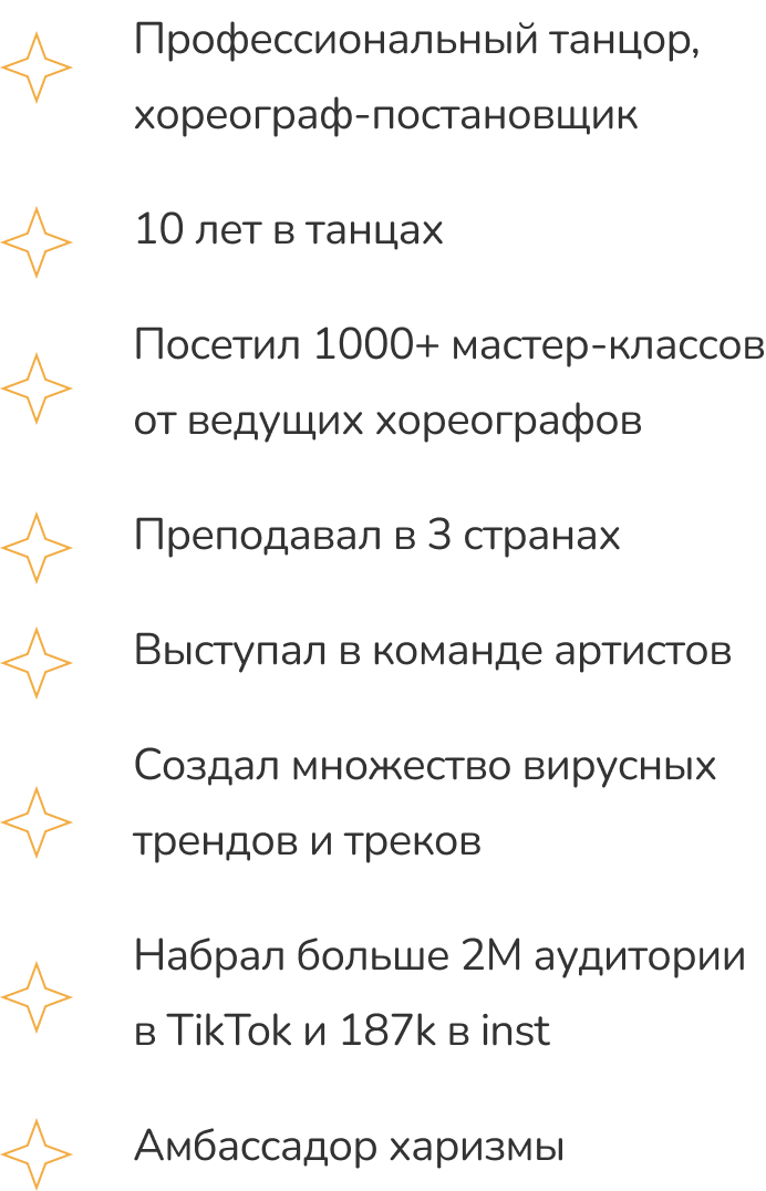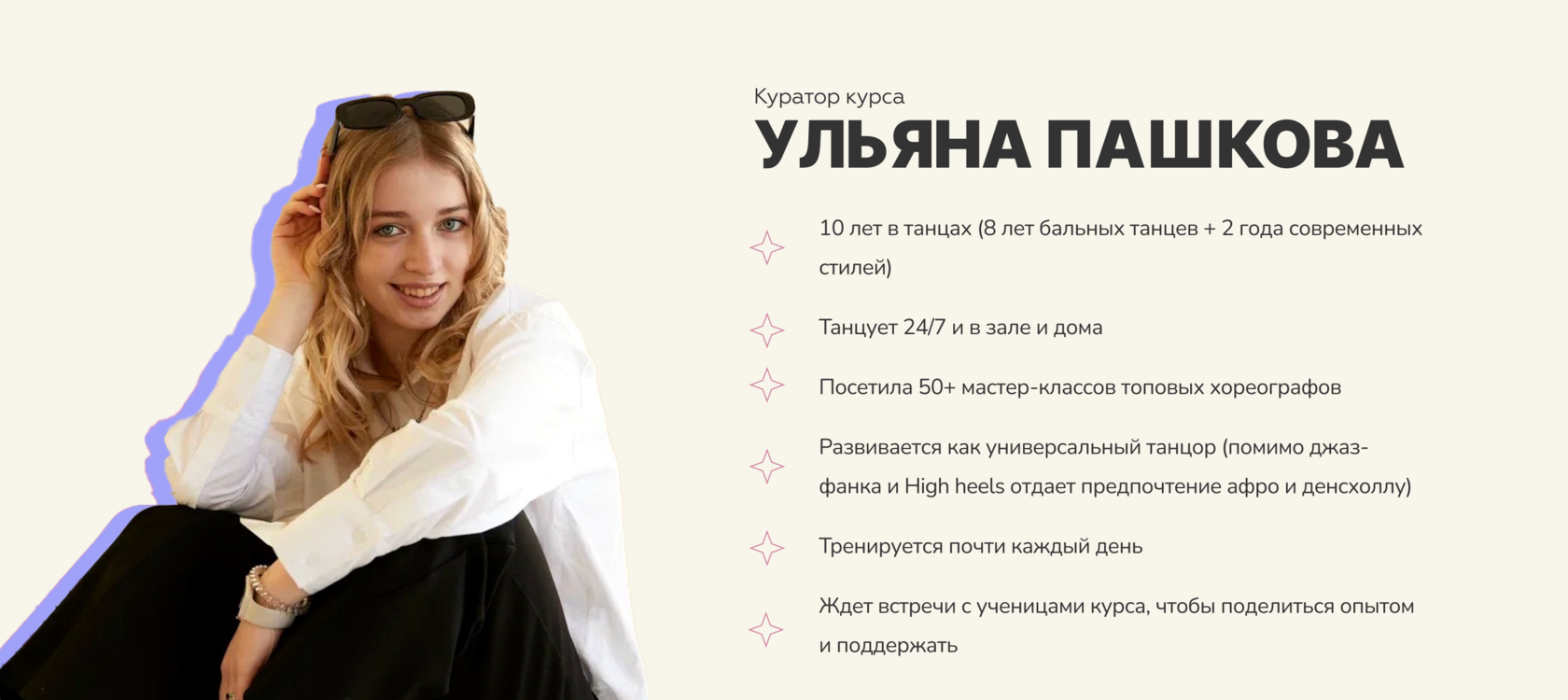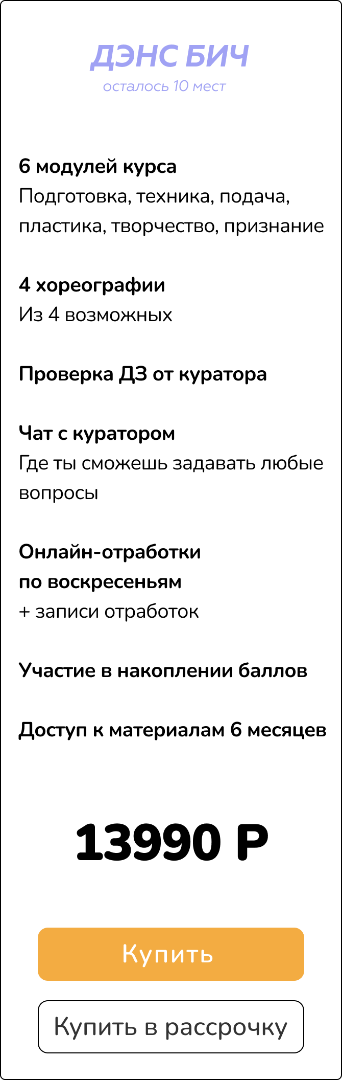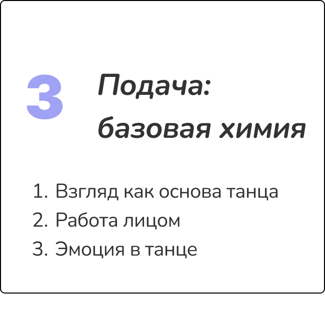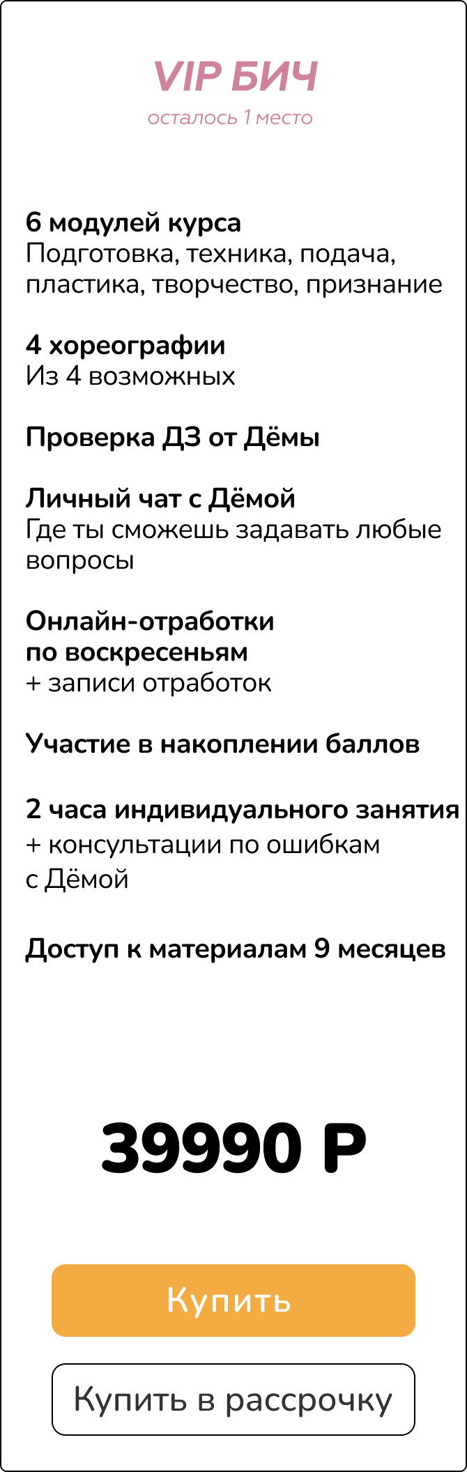 На курсе мы посвящаем время не только разучиванию конкретных связок, но и развитию твоей базы. Тебе будет доступна библиотека знаний, где ты сможешь освоить разные техники, отработать их во время курса + узнать полезные лайфхаки о съемке, постановках и т.д.