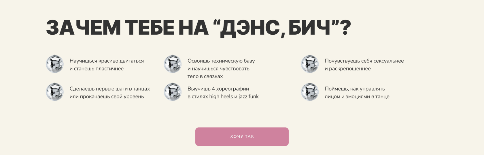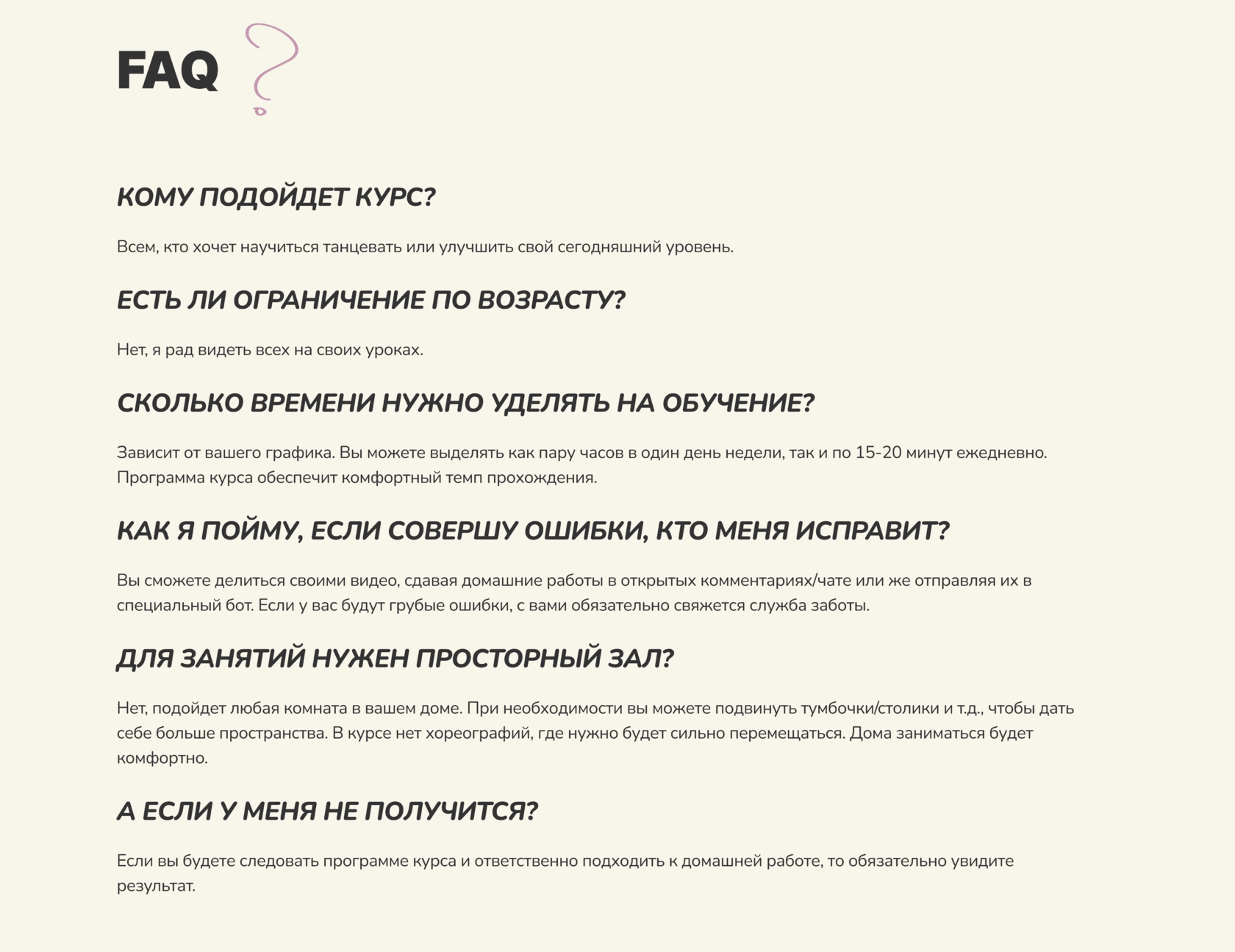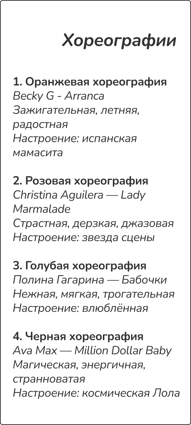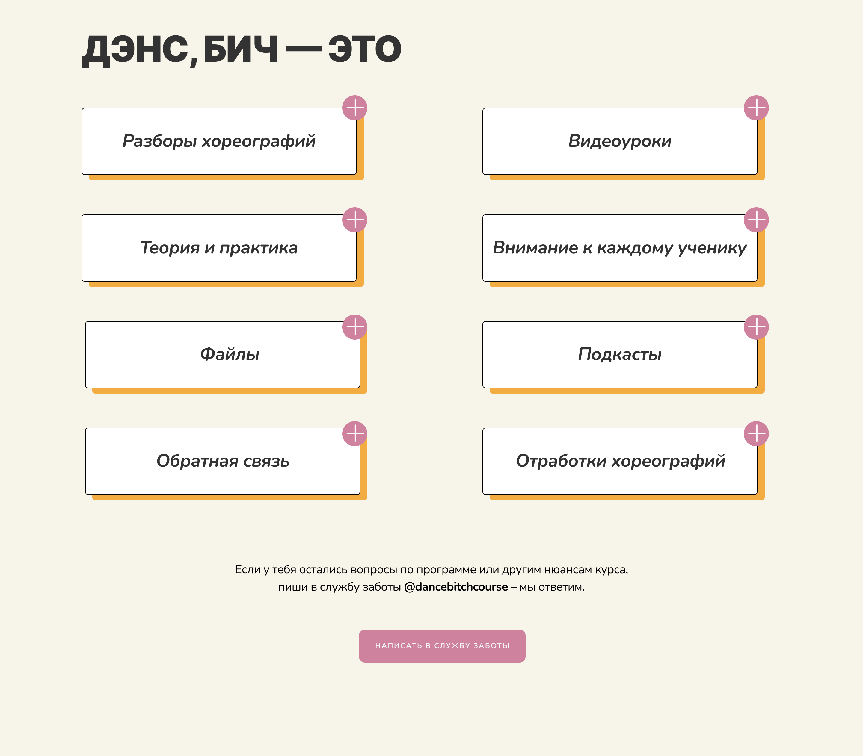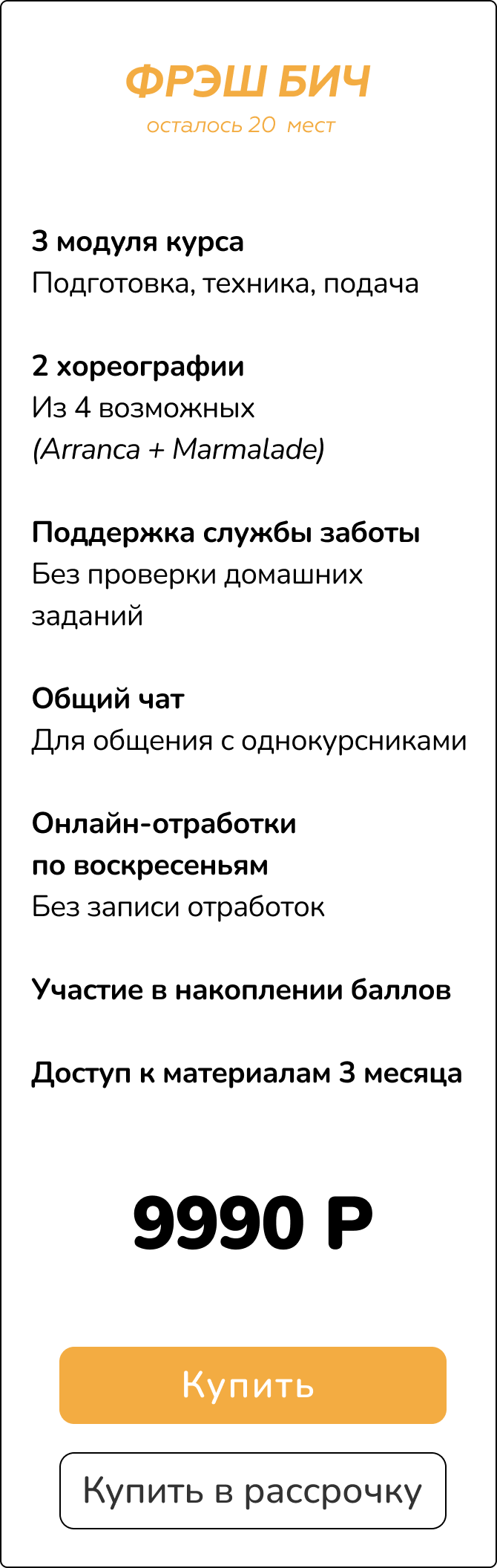 На курсе мы посвящаем время не только разучиванию конкретных связок, но и развитию твоей базы. Тебе будет доступна библиотека знаний, где ты сможешь освоить разные техники, отработать их во время курса + узнать полезные лайфхаки о съемке, постановках и т.д.