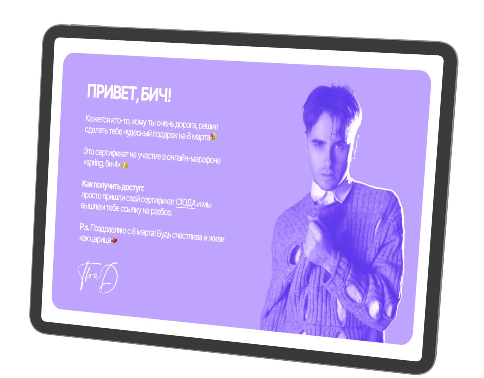 Приобретай счастье вподарок на8марта длясвоих близких — мы вышлем тебе красивый сертификат, чтобы ты смог(ла) его отправить!